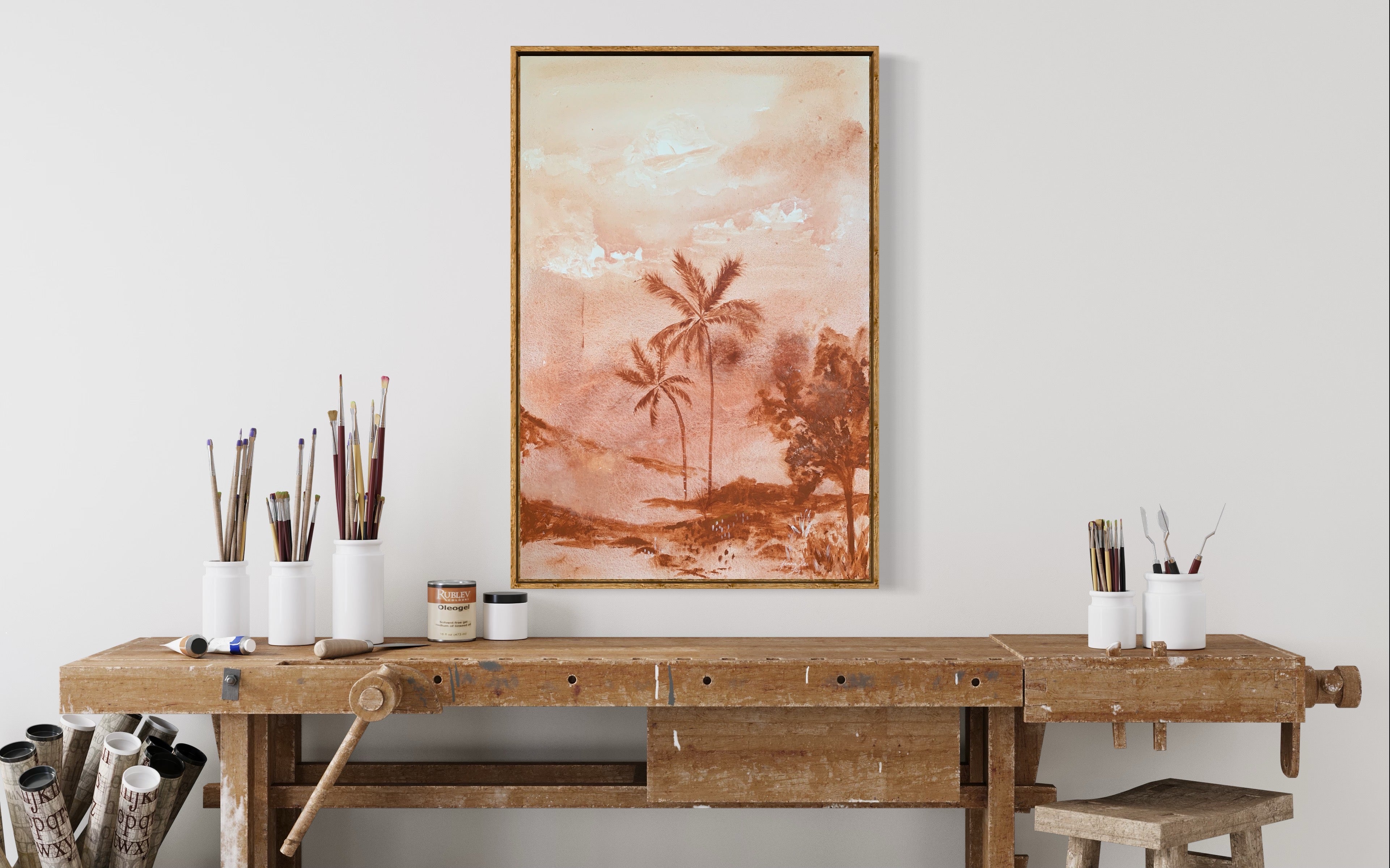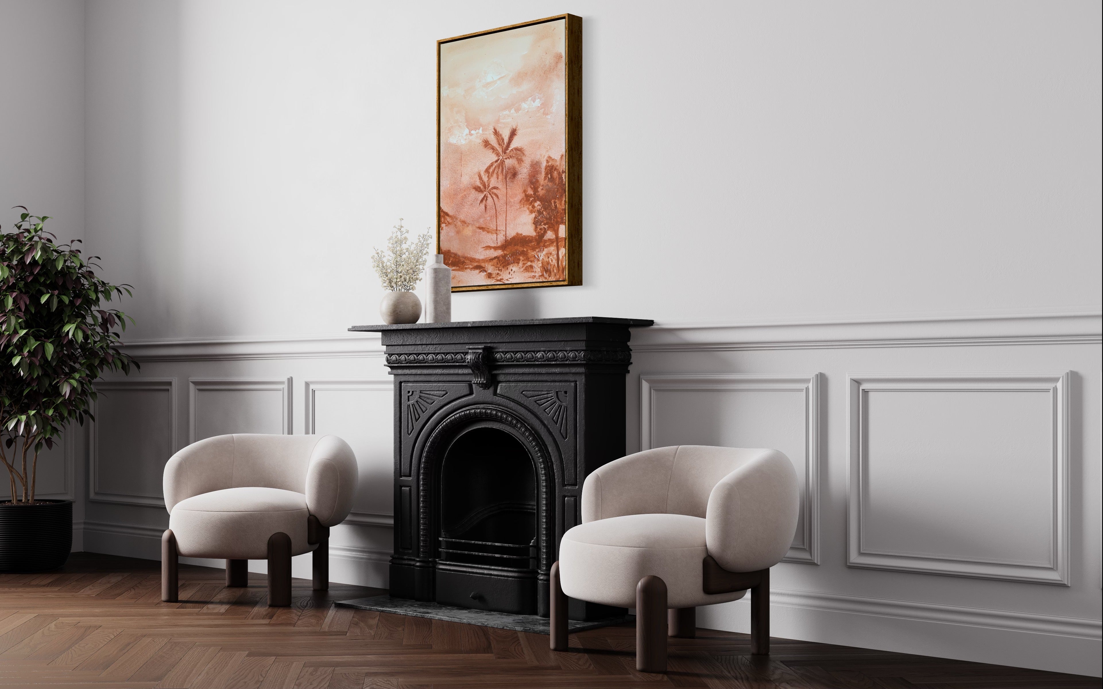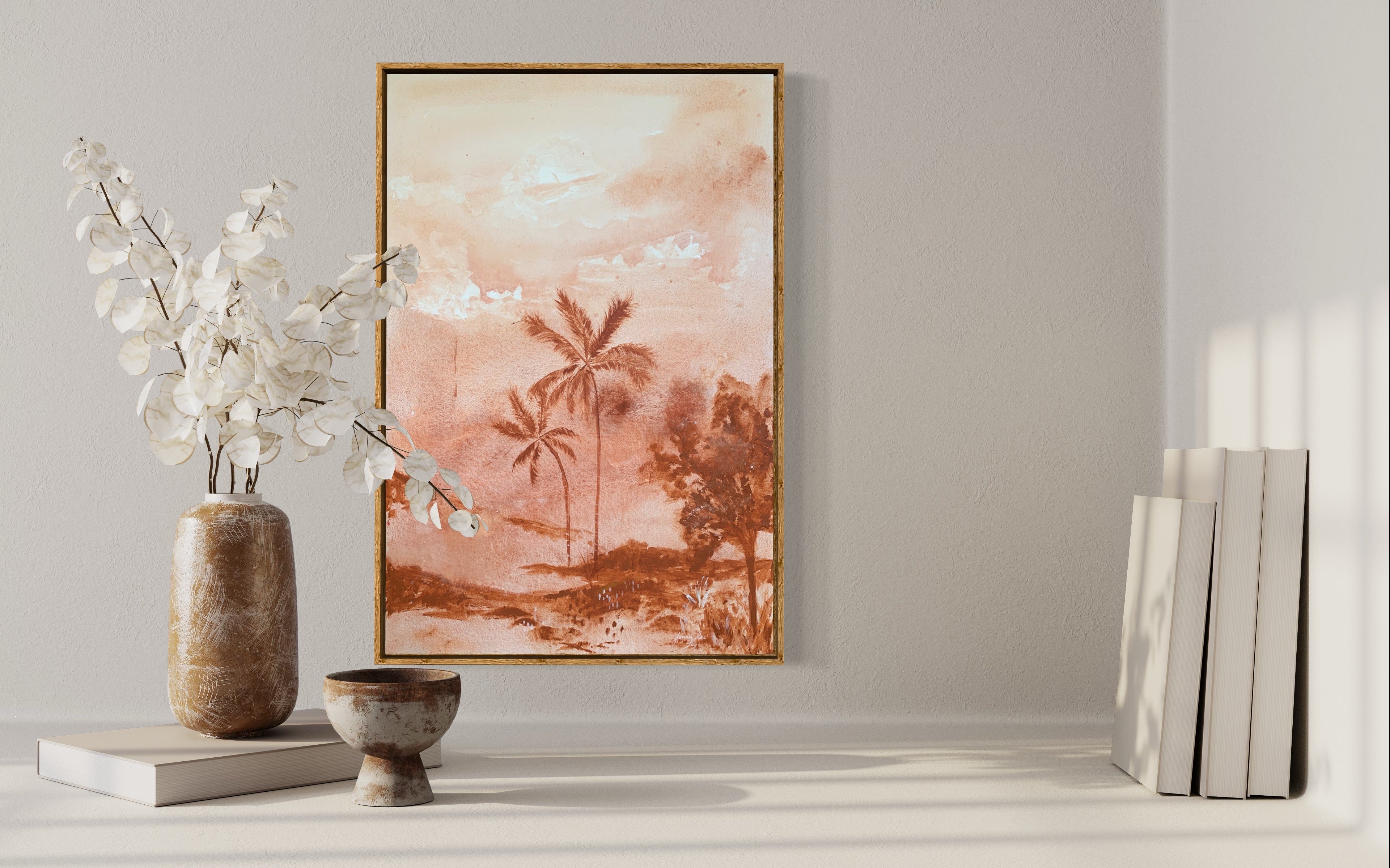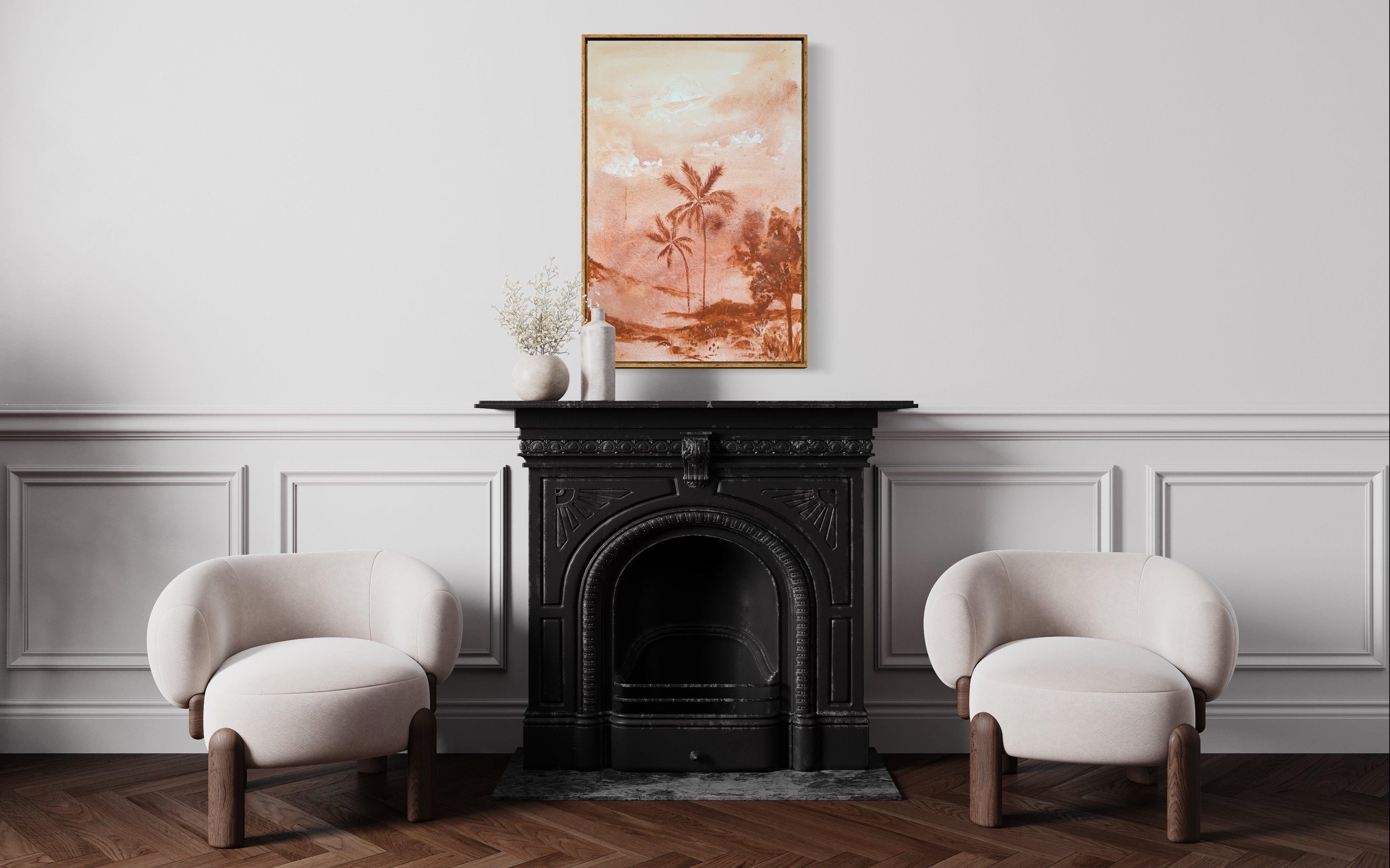 Landacape- Misty Mountain #2 by Jenna Lee Joy - This diptych is Inspired by the hinterlands of the Tweed Valley and Byronbay with rolling mountains, shrubbery and scattered palms. This monochromatic artwork speaks from the heart, "this is where I live, where we live'. It takes us back to memories of distant places with its dream-like qualities.60 x 90cm Oak solid wood float frame.