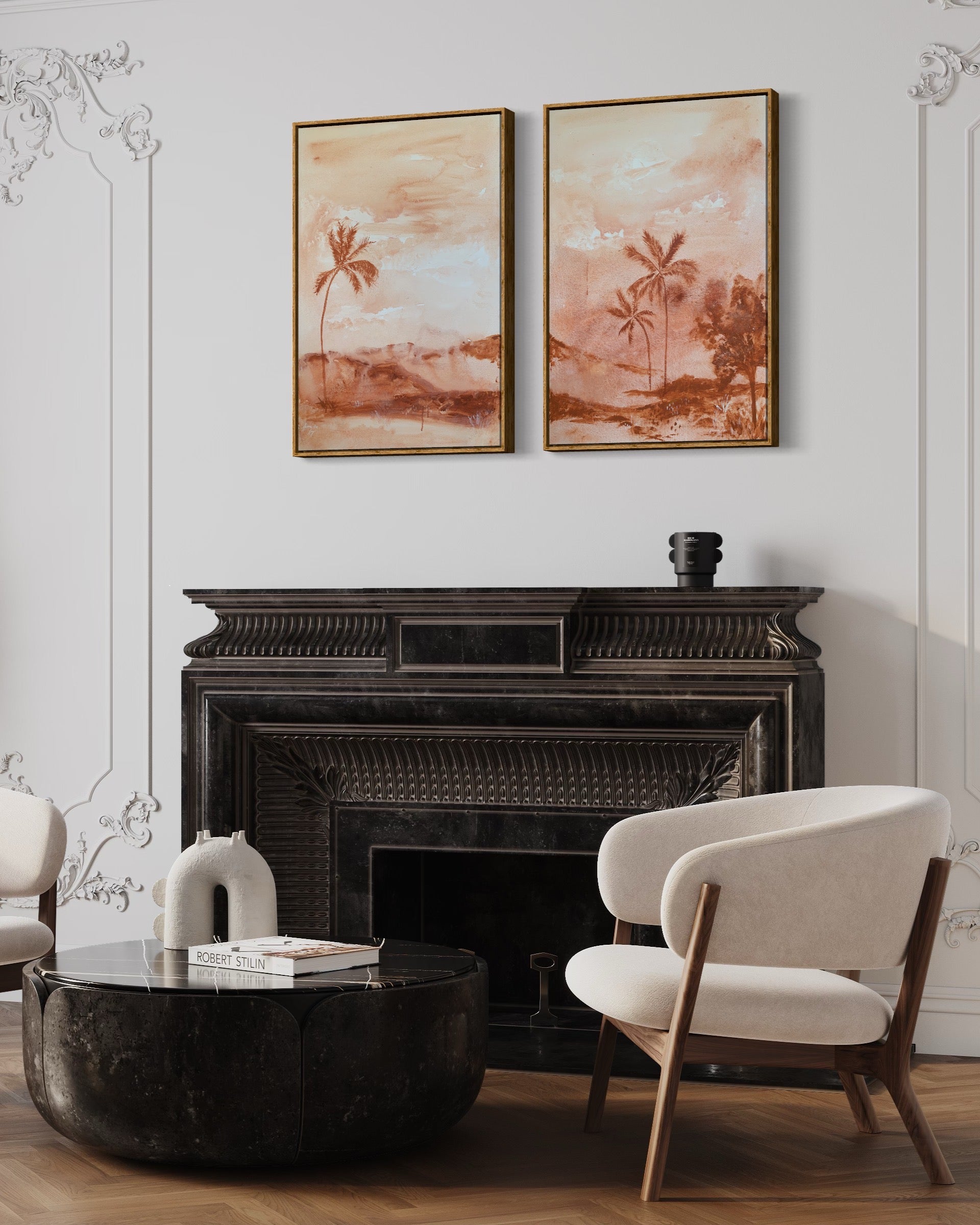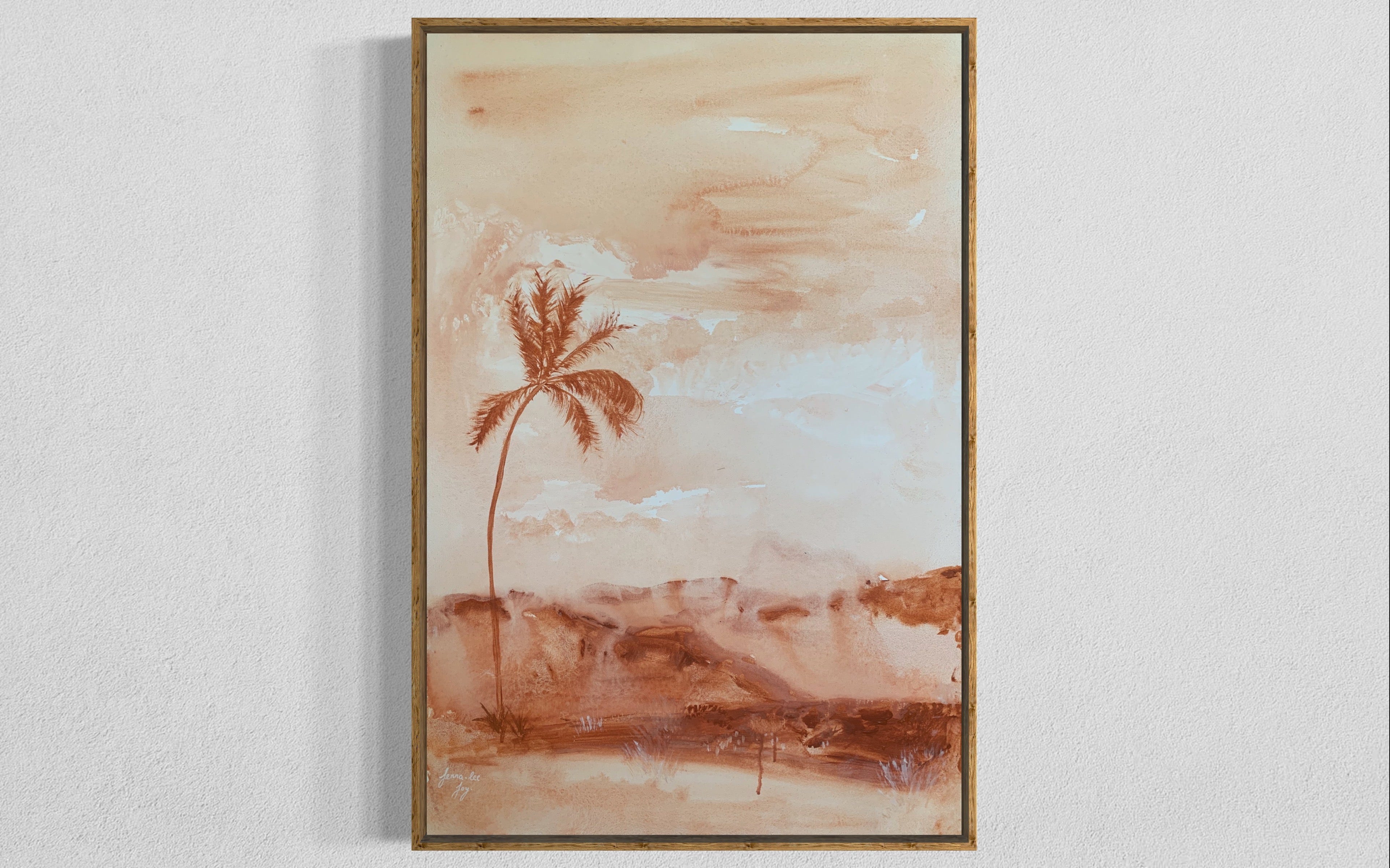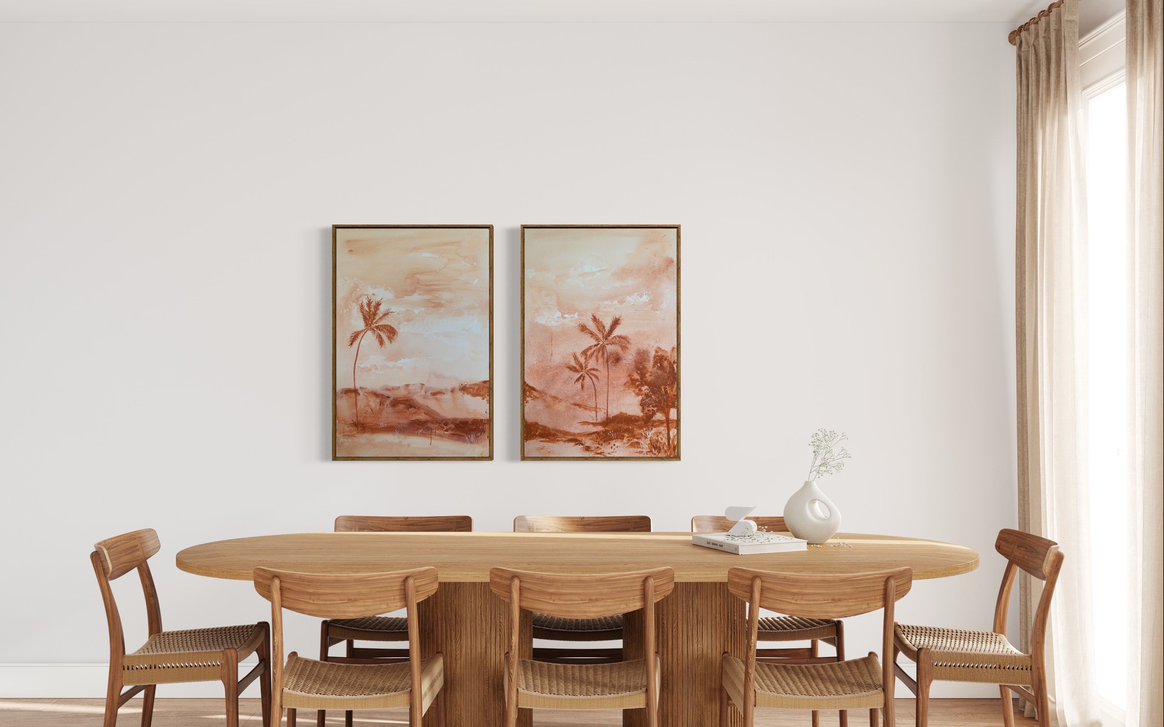 Landacape- Misty mountain #1 by Jenna Lee Joy - This diptych is Inspired by the hinterlands of the Tweed Valley and Byronbay with rolling mountains, shrubbery and scattered palms. This monochromatic artwork speaks from the heart, "this is where I live, where we live'. It takes us back to memories of distant places with its dream-like qualities.60 x 90cm Oak solid wood float frame