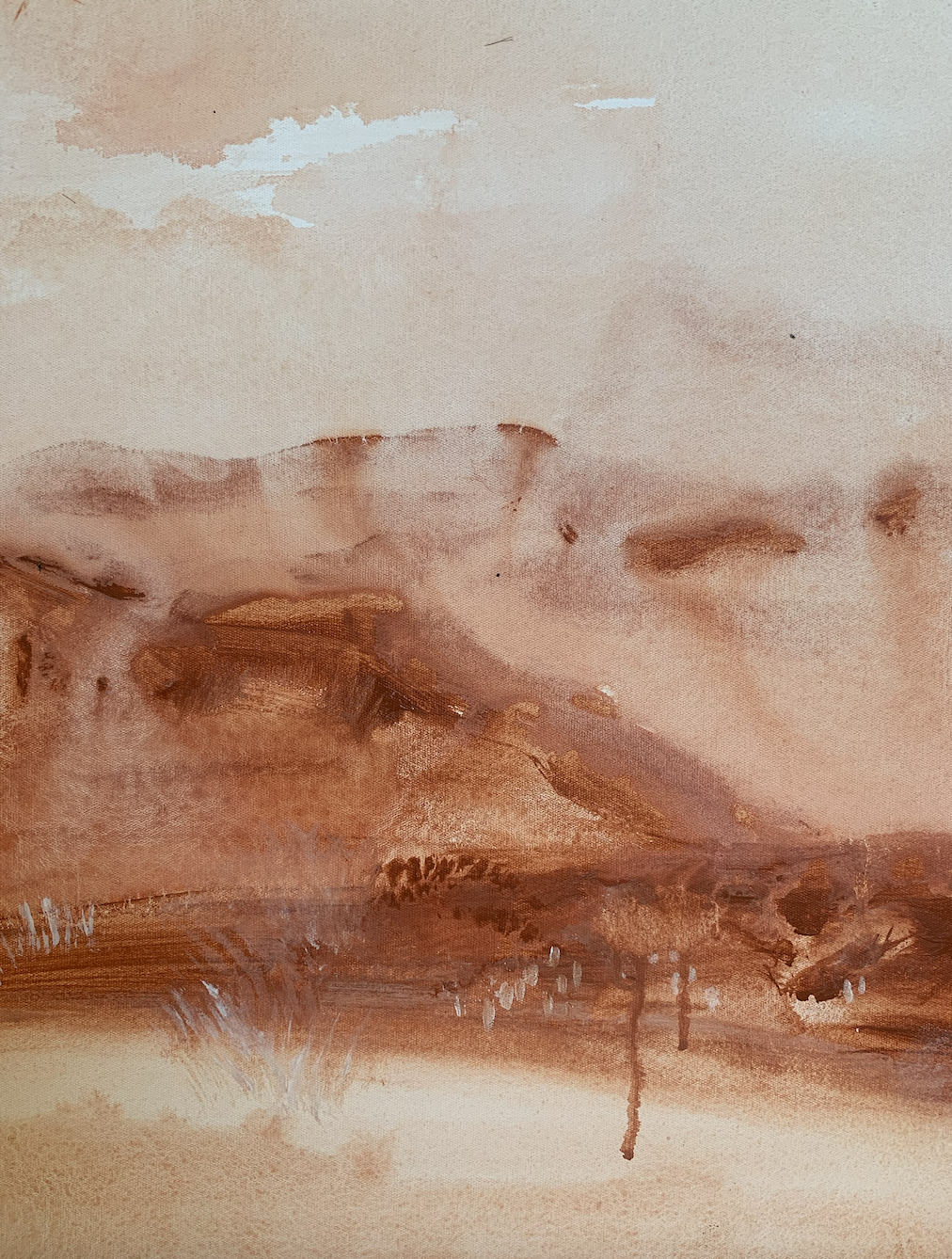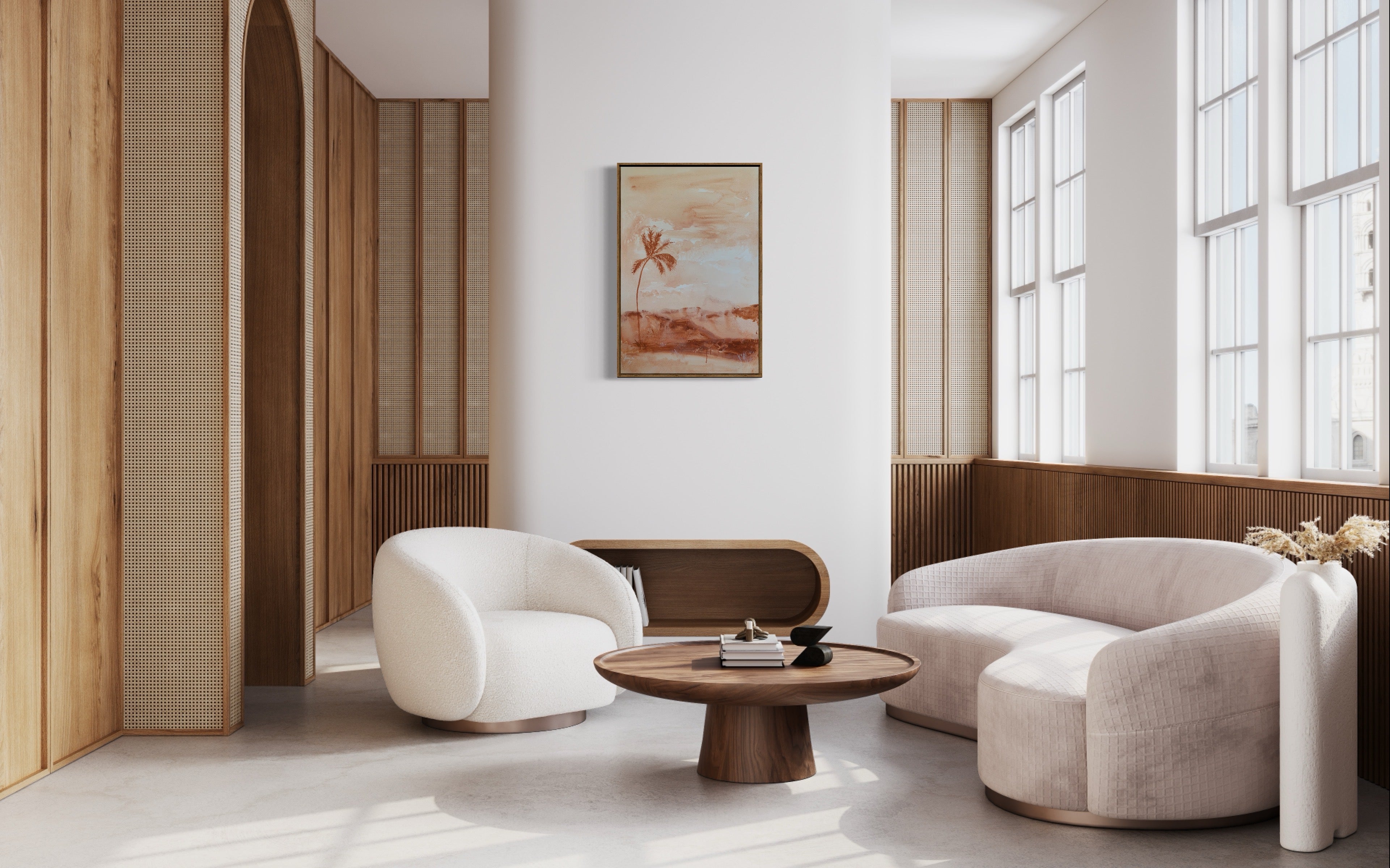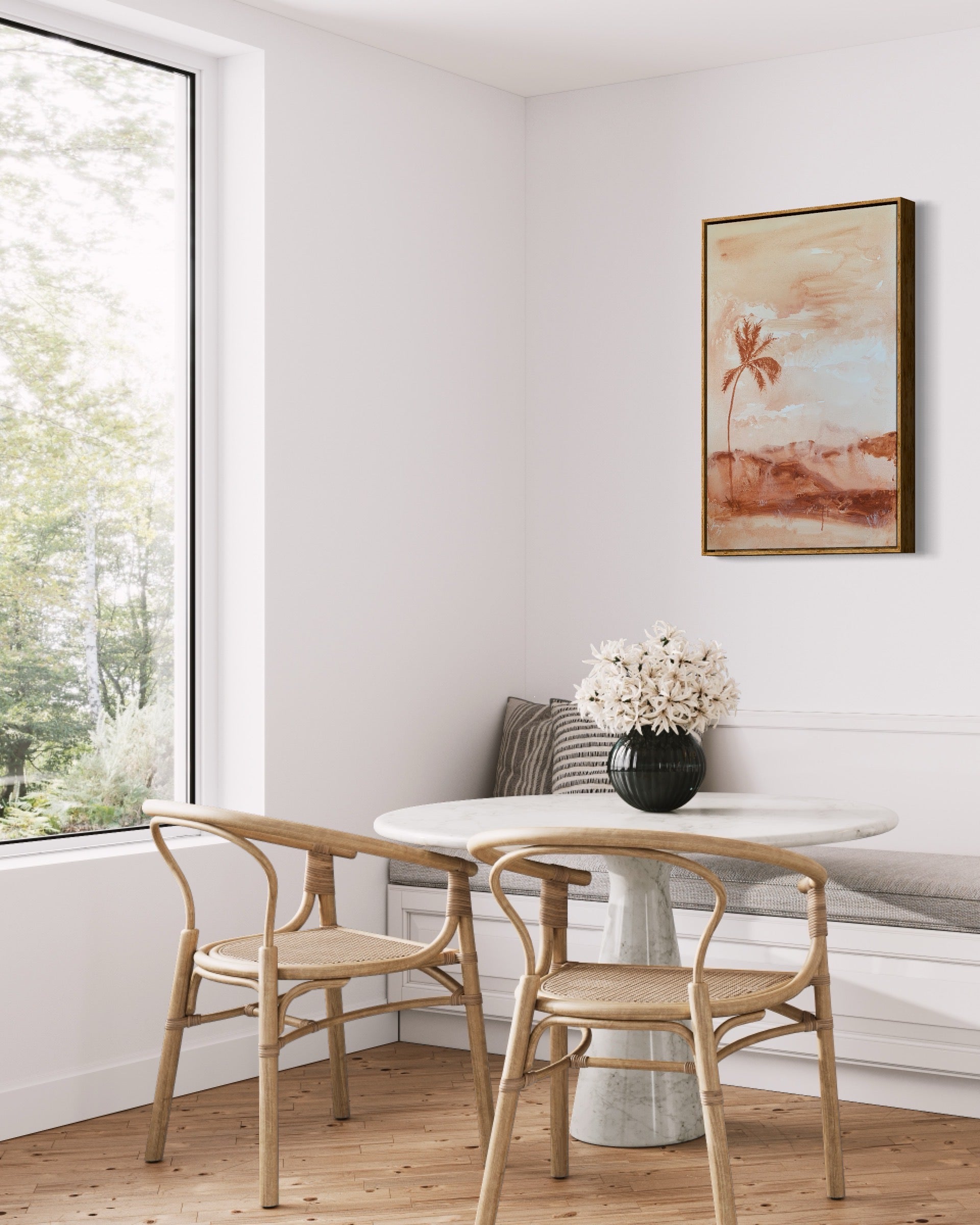 Landacape- Misty mountain #1 by Jenna Lee Joy - This diptych is Inspired by the hinterlands of the Tweed Valley and Byronbay with rolling mountains, shrubbery and scattered palms. This monochromatic artwork speaks from the heart, "this is where I live, where we live'. It takes us back to memories of distant places with its dream-like qualities.60 x 90cm Oak solid wood float frame