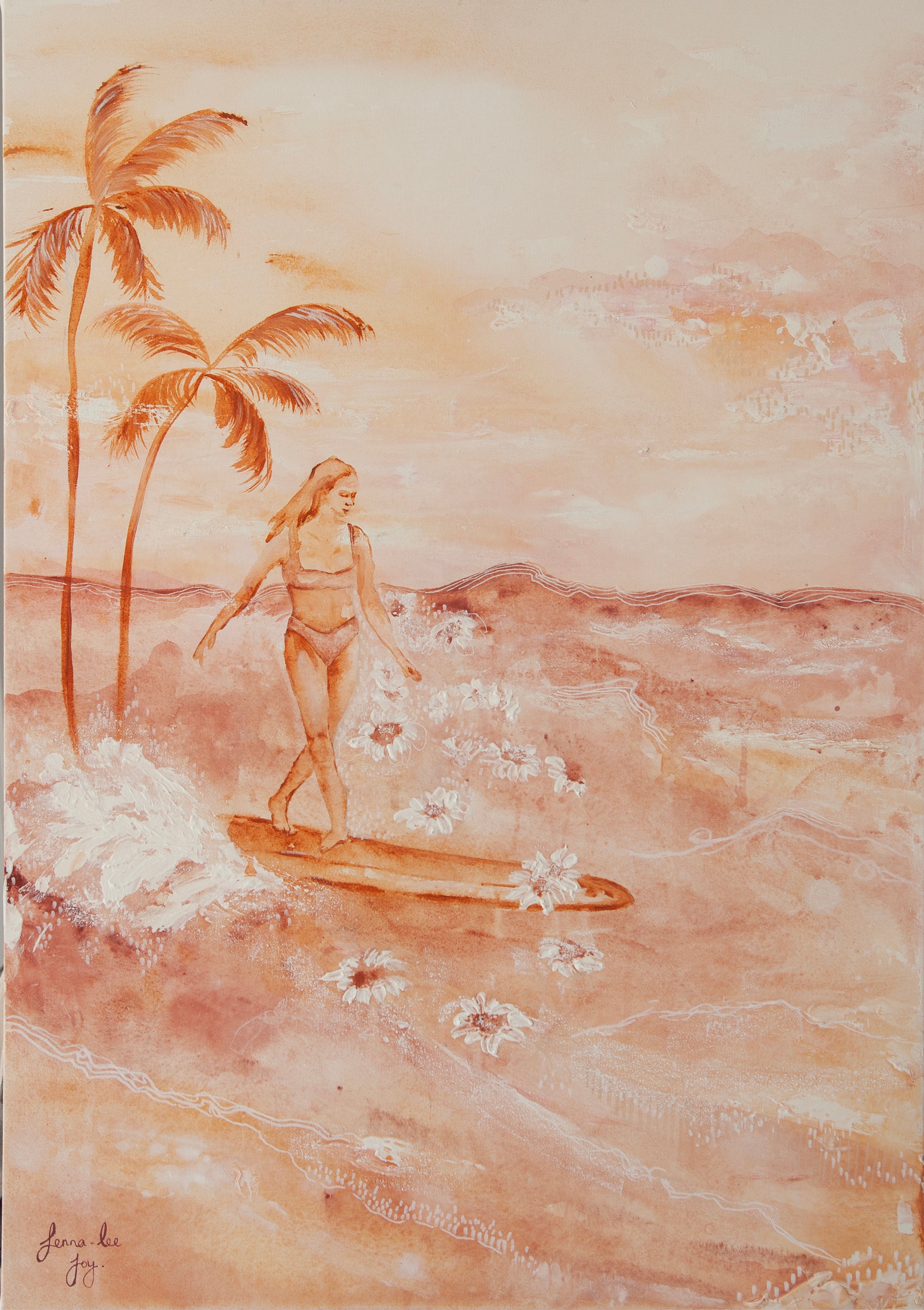 Surf Melody by Jenna Lee Joy - Girl riding a wave at sunset with soft daisy's. Captures the culture of surfing. Riding waves and spending time in the sun and the sea with salt in your hair. It takes on a feminine perspective with the figure of the girl and daisys. Inspired by the Tweed Valley. This modern landscape captures a soft detailed impression of the Tweed River and surrounding area.